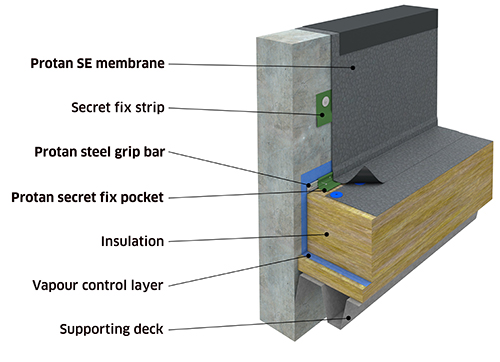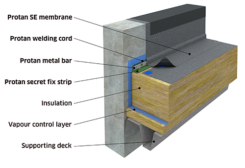 Protan erfordert eine liniare Befestigung der Dichtungsbahn am Übergang zwischen Dachfläche und Brüstung. Unsere Stahlklemmschiene sorgt für eine gute Luftabdichtung und eine lineare Befestigung und verringert ausserdem das Risiko einer Punktbelastung an den Schweissnähten und Befestigern. Die Festigkeit und Steifigkeit der Stahlschienen sorgen dafür, dass horizontale und vertikale Kräfte in der Dachabdichtung als gleichmässig verteilte Last übertragen werden. Wir akzeptieren verschiedene technische Lösungen für die Attikabefestigung, aber bei allen müssen die zugelassenen Stahlklemmschienen von Protan verwendet werden.